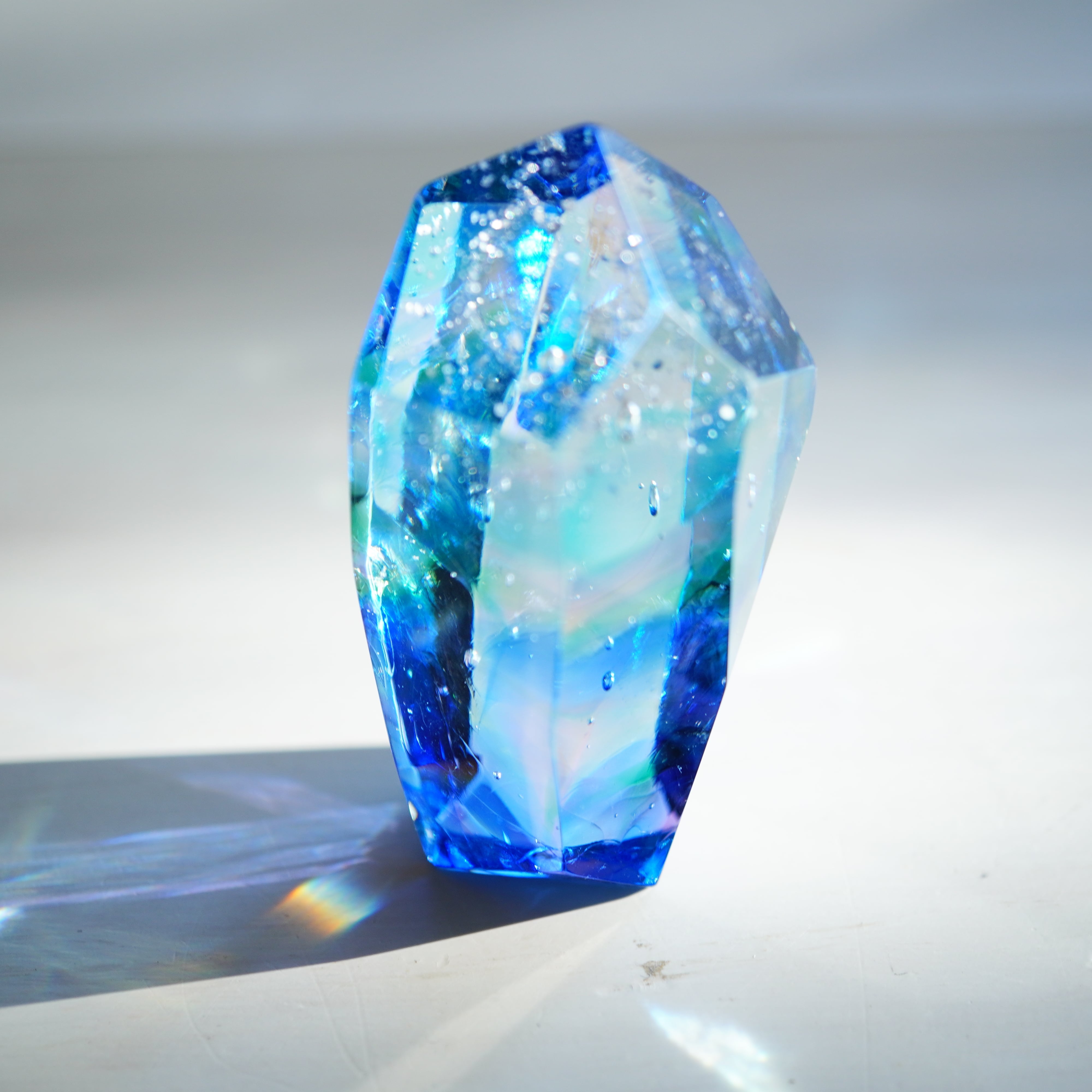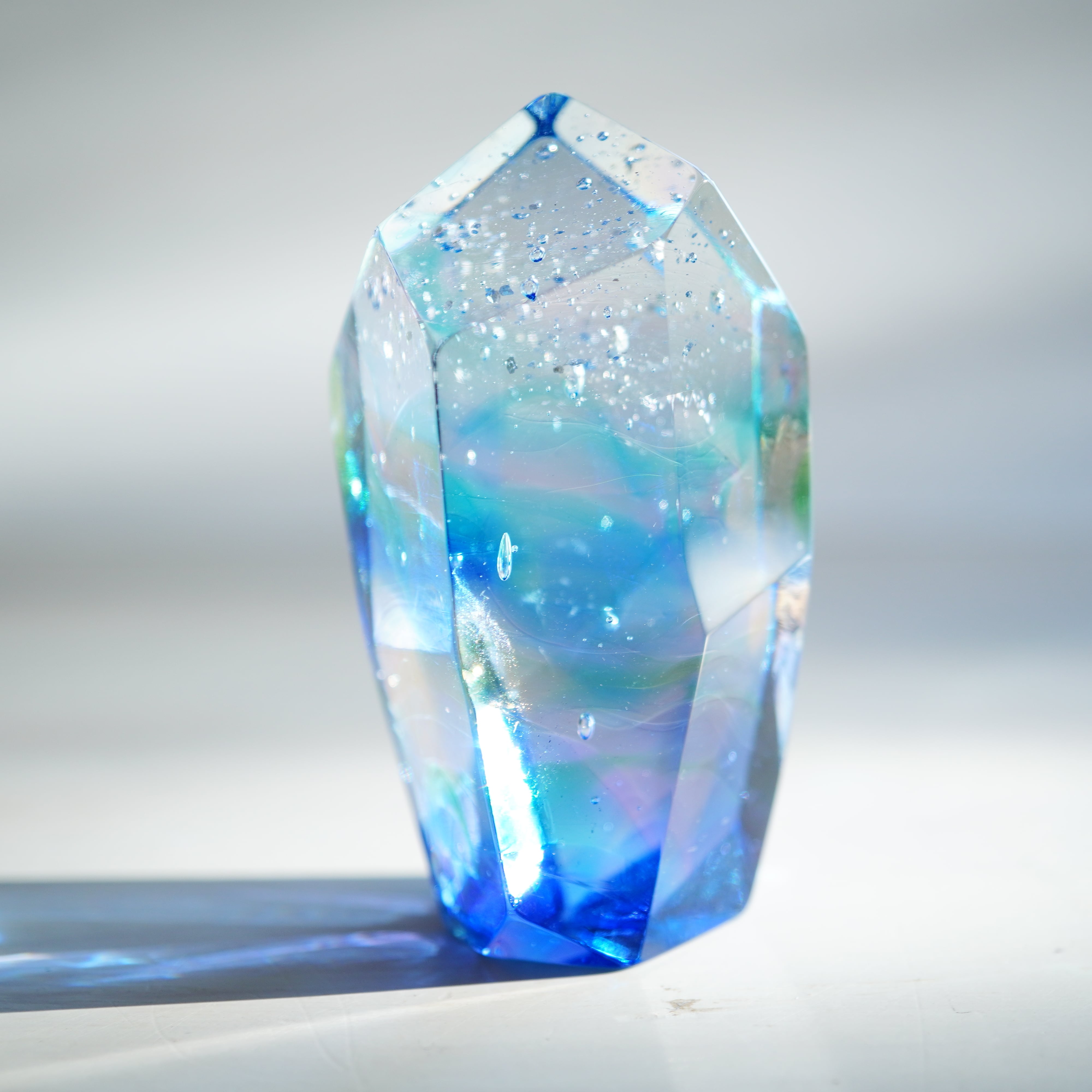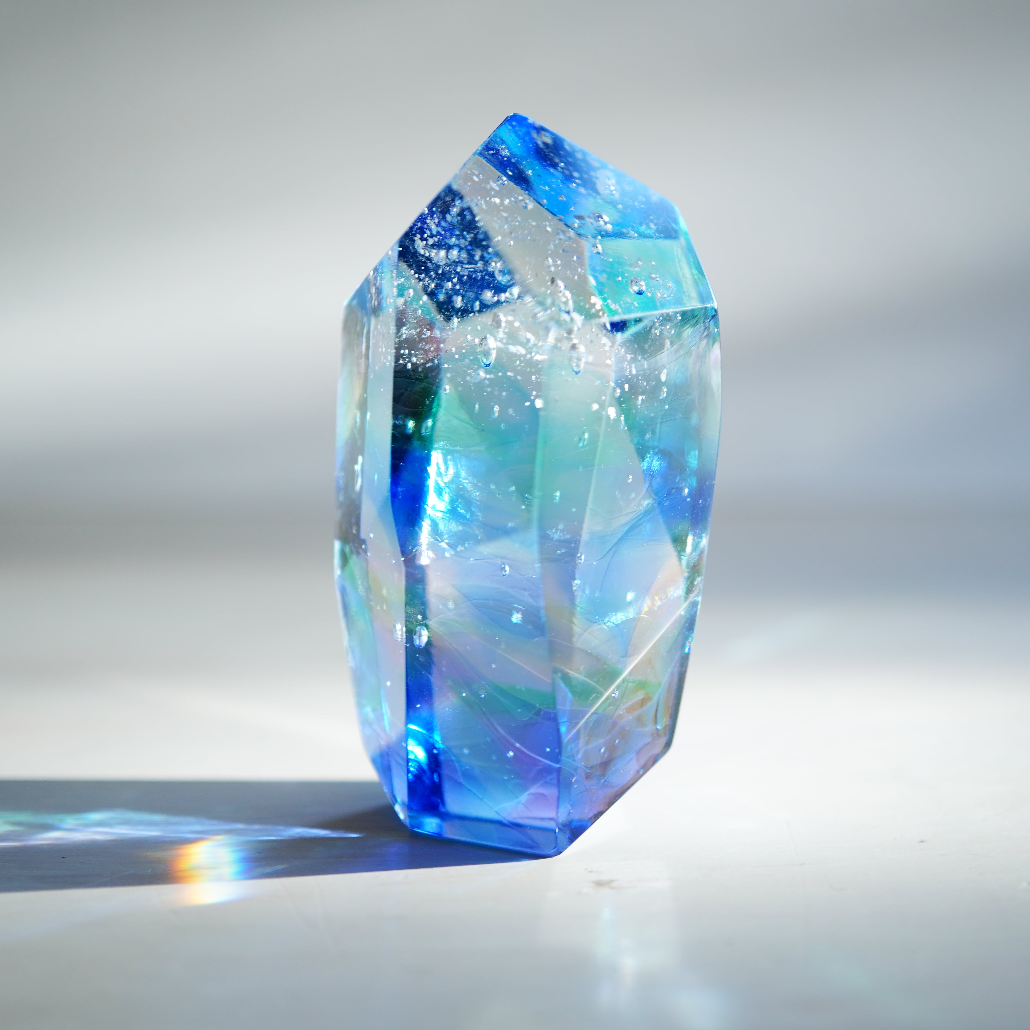作品は、ガラスの原石から丁寧に削り出し、成型、研磨して仕上げています。1つ1つが全て異なる作品になるため、そのユニークな特性を楽しんで選んでいただけたら幸いです。